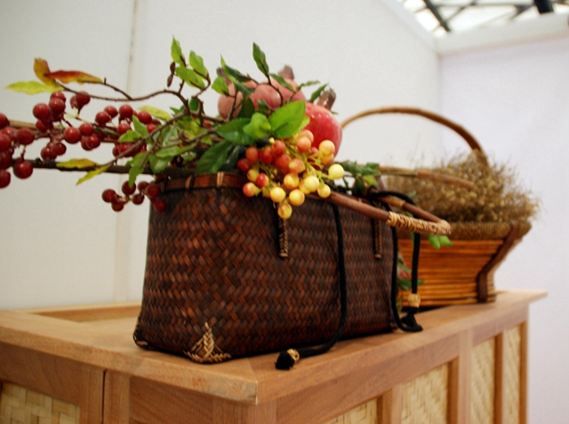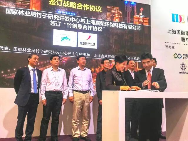 ▼上海嘉荣环保科技有限公司总裁韩慧琴和国家林业局竹子研究开发中心副主任陈玉和签订“竹创意合作协议”