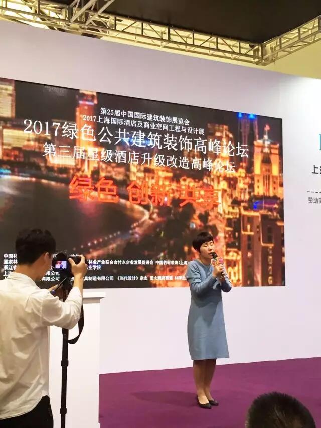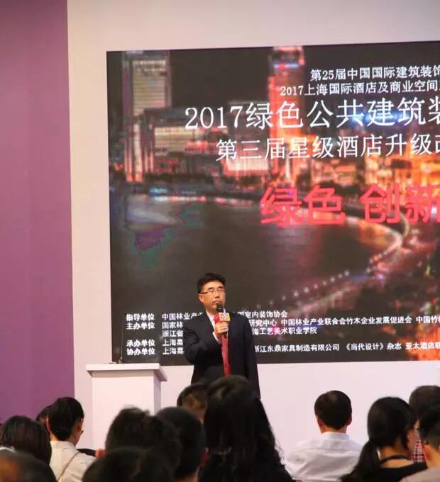 为贯彻“创新、协调、绿色、开放、共享”的发展理念,支持生态文明建设,保护环境,坚持绿色低碳发展。由国家林业局竹家居工程技术研究中心、上海工艺美术职业学院、中国林业产业联合会竹木企业发展促进会、中国竹材装饰(上海)设计应用推广中心联合主办,上海嘉荣建设工程有限公司、浙江东鼎家具制造有限公司、亚太酒店联盟、《当代设计》杂志、SIDP上海国际设计师平台、浙江省杭州市余杭区百丈镇联合承办了《2017绿色公共建筑装饰高峰论坛暨第三届星级酒店升级改造高峰论坛。