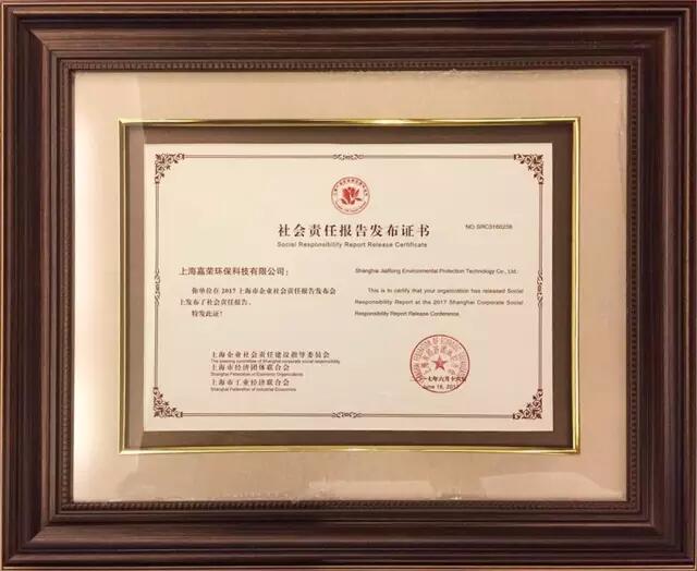 ▼嘉荣社会责任报告发布证书